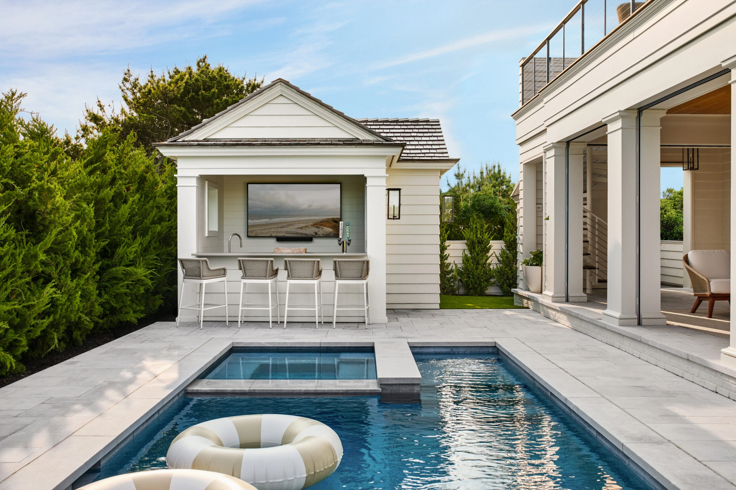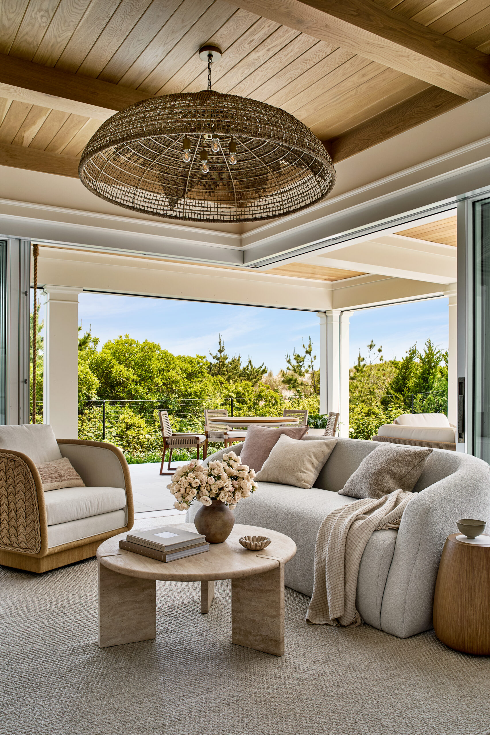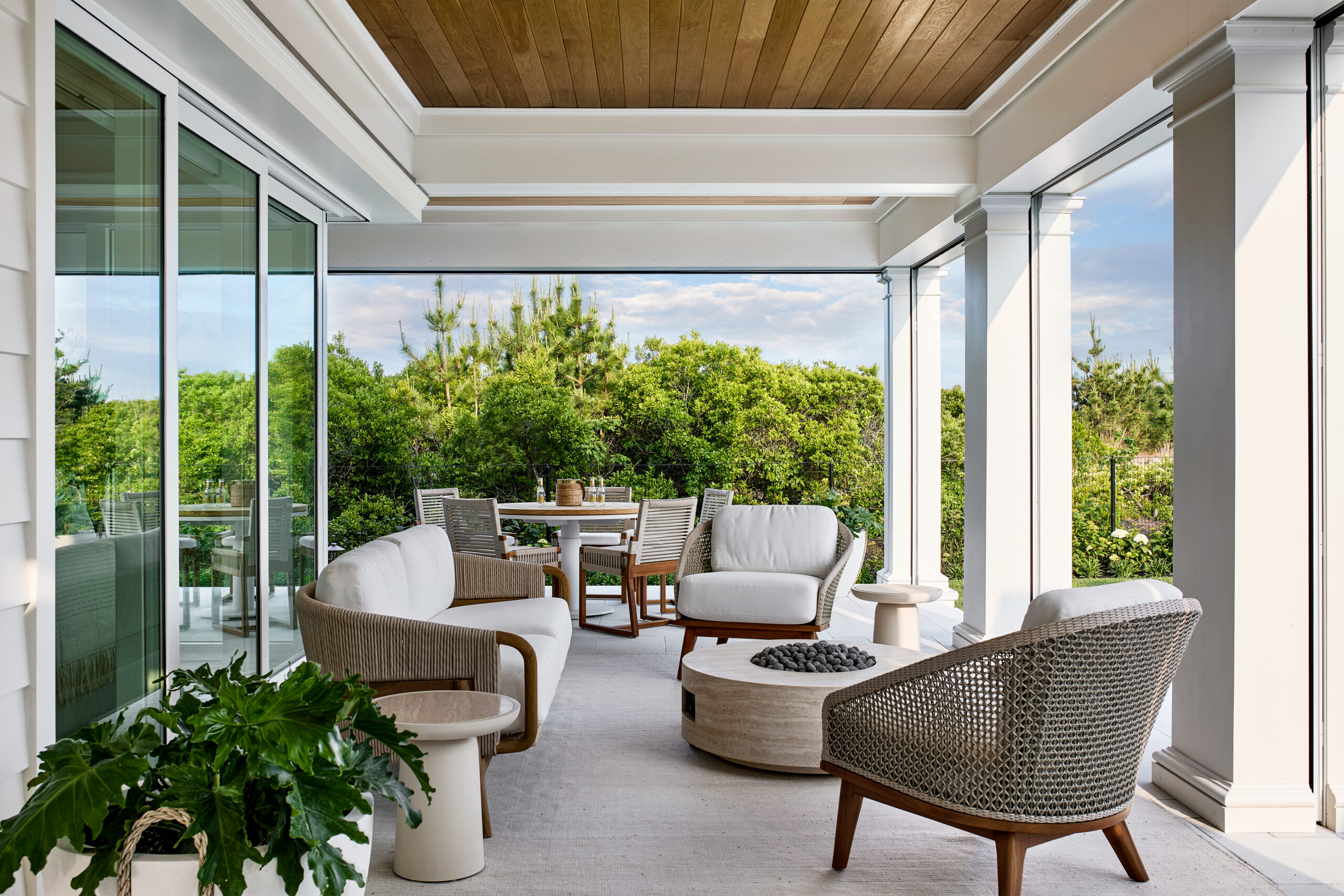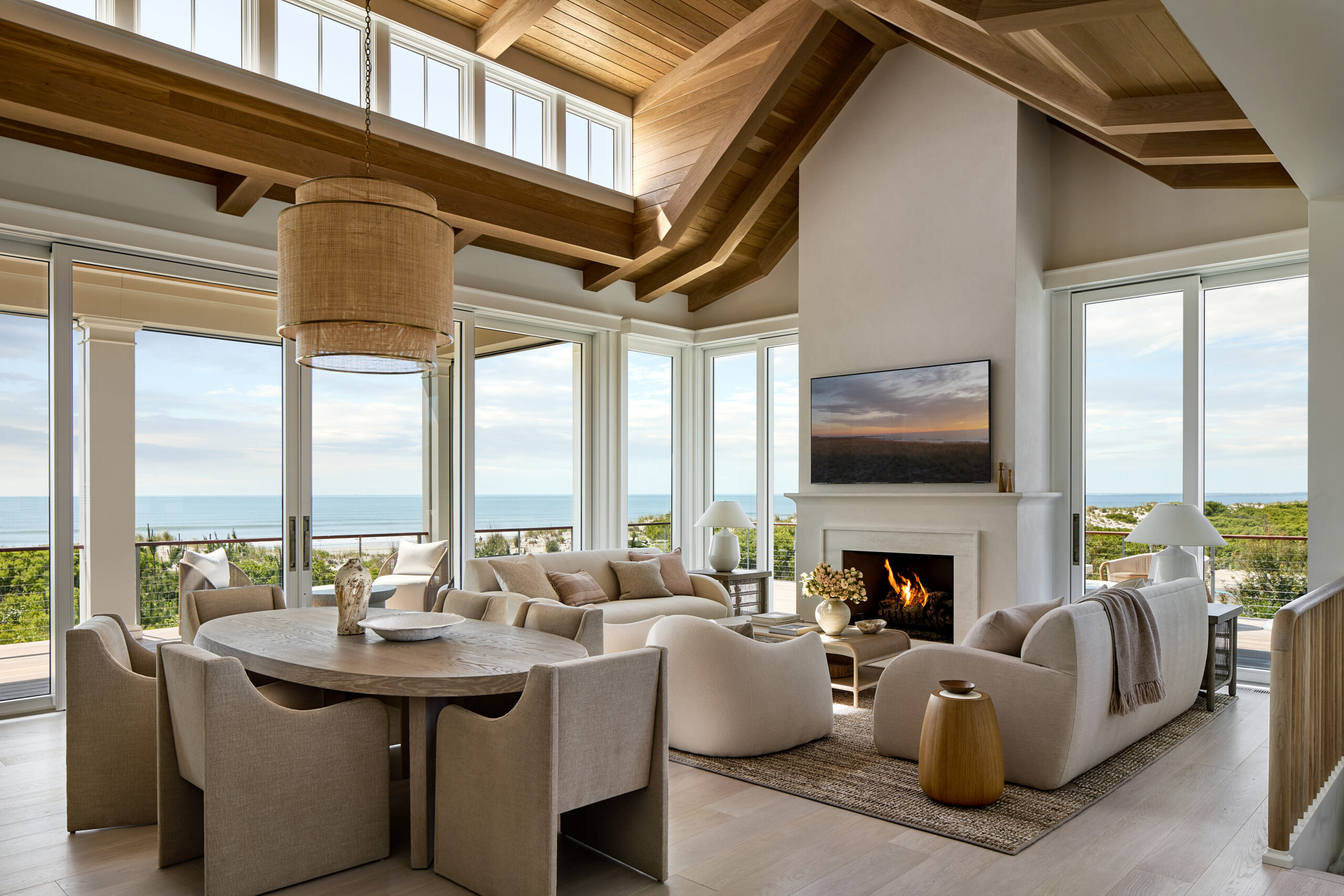 Nestled at the tip of Seven Mile Island, this home captures panoramic dune and ocean views from every living space. The design is relatively compact, yet the raised ceiling heights add a sense of volume and light. The exterior preserves a traditional aesthetic while warm oak interior and exterior finishes add texture and richness. Ten-foot lift-and-slide doors open fully to the view, complemented by discreet roll-down screens and shutters for comfort and protection.